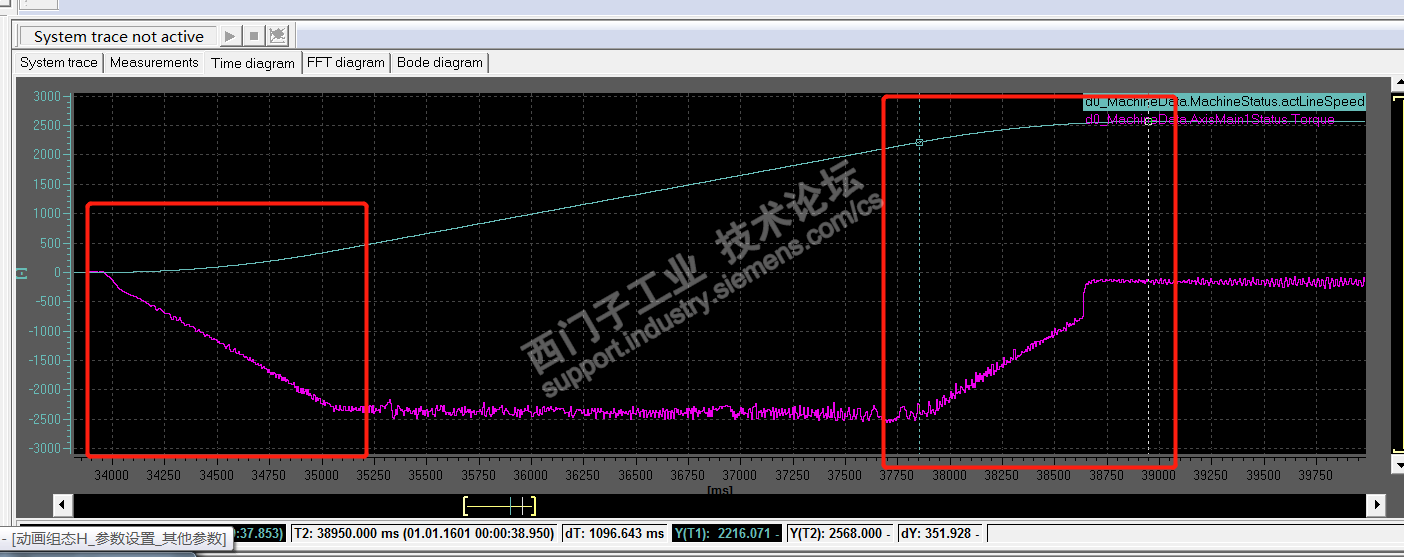 哦,好像看明白了,你的蓝线是电机的速度实际值,紫线是电机在加速过程的转矩实际值。哈哈,这个紫色的曲线恰恰是反映S型加速。你画的红框里,转矩实际值不是直线,是斜线,转矩是变化的,加速过程就不是线性变化的了。加速过程的两头有圆弧。而紫线的水平段,就是恒加速(匀加速)过程,他反映的转速也是有斜率线性变化。