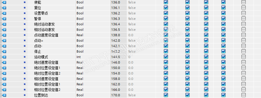为伺服建立一个DB块,使能、复位、激发等指令用bool,位置、速度用real,然后做偏移,生出地址。