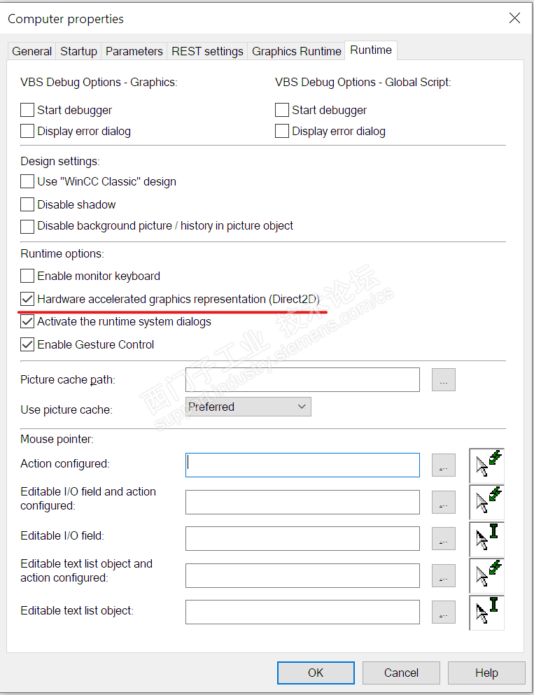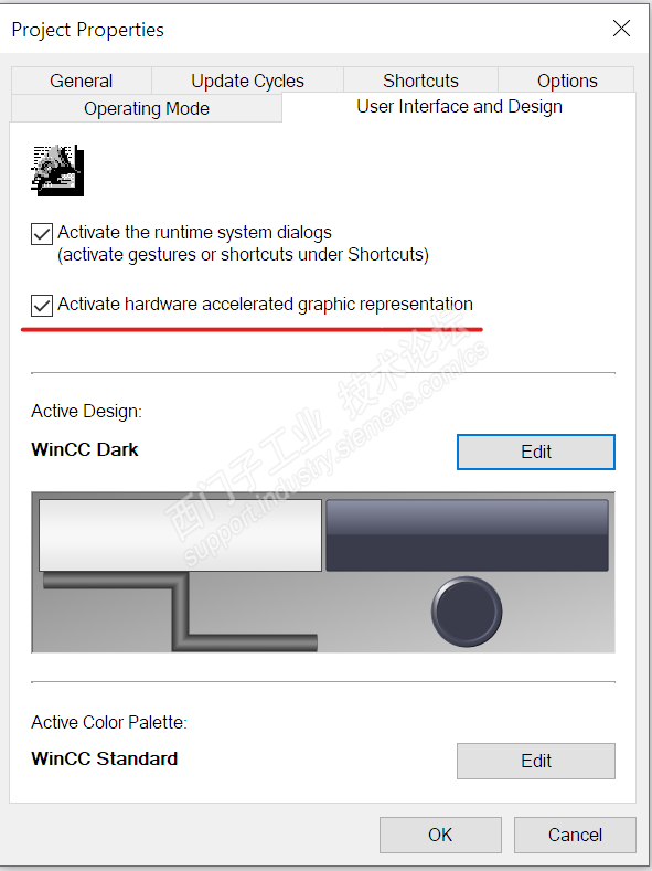 也可以参考下图取消WinCC项目属性和运行系统中的硬件图形加速功能