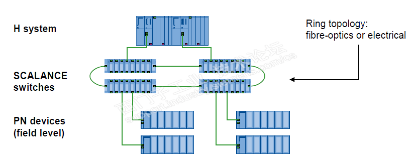 图3、H CPU配XC交换机成环+下挂PN devices。是否可以XC交换机不成环,在H CPU侧两个PN口连起来成环?是否能这样做组网,不知道PLC程序网络组态配置上又有什么不同呢?