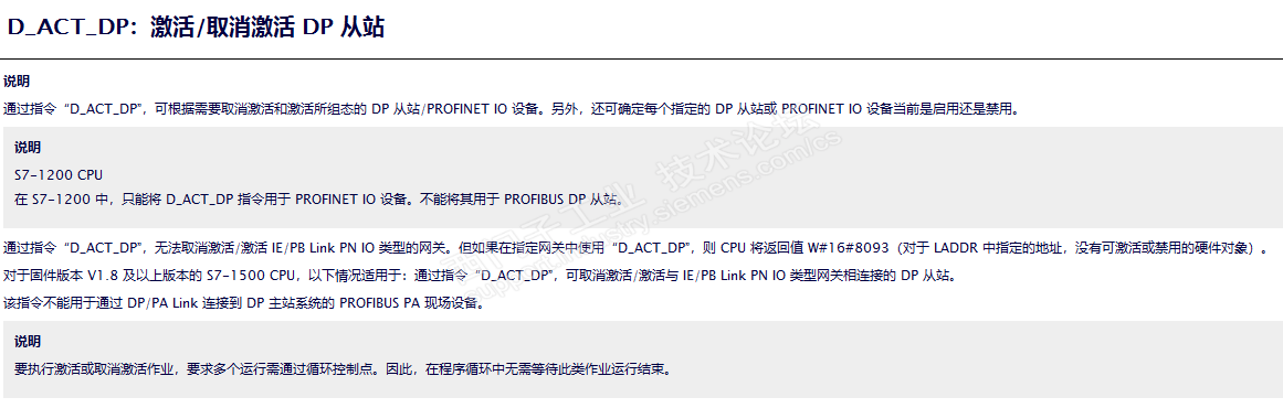 对于固件版本 V1.8 及以上版本的 S7-1500 CPU,以下情况适用于:通过指令“D_ACT_DP”,可取消激活/激活与 IE/PB Link PN IO 类型网关相连接的 DP 从站。