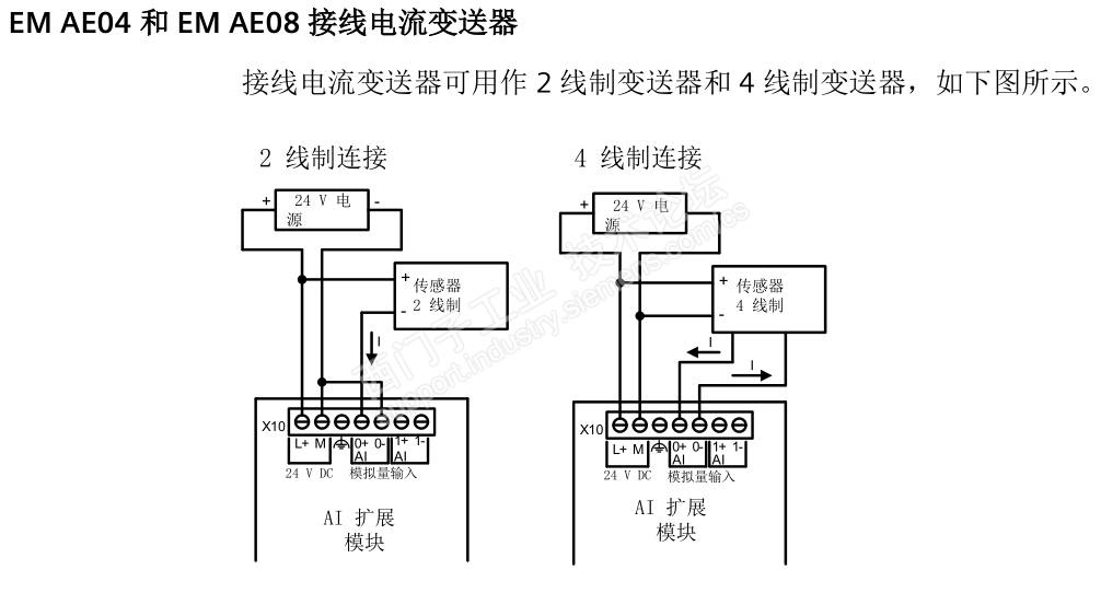 再补充一种情况就是传感器仪表是两线制而模拟量采集模块又是没有电源输出给传感器仪表的,此时需要用户外加一个电源,三者一起形成电流信号的产生,传输,检测回路。SMART200的AE模块就是这样的模拟量采集模块,下面给个手册节选的图片说明这一点。图片中对四线制传感器仪表的连接也有说明。