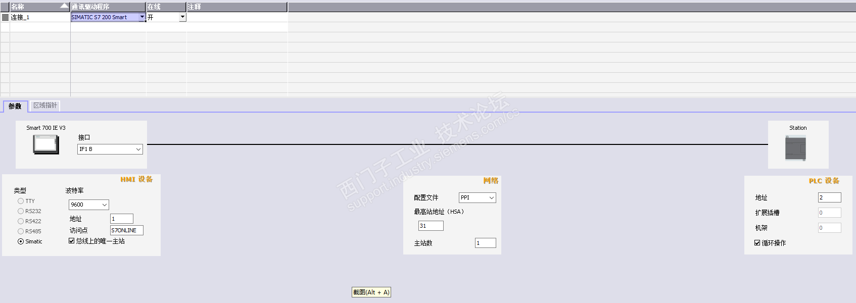 你把配置文可以选择“MPI”再去试试看。你触摸屏设置没什么问题。关键看你通讯线是不是有问题,通讯线可以自己做,3脚对3脚,8脚对8接。还有你PLC 485口只能是PPI通讯,如果你PLC口做了modbus rtu通讯或是自由口通讯就不能和触摸屏通讯,你需要增加一个通讯板来和触摸屏通讯。这款触摸屏是可以和smart200 走串口通讯。只要硬件没问题,硬件包括两边通讯口,和通讯线,再就是PLC通讯不能做其他通讯只能是PPI通讯就可以。我前几年一致都是用smart200和smart line V3走串口通讯。只是现在不用smart 200PLC和smart line 触摸屏了,现在就没有这些东西了。
