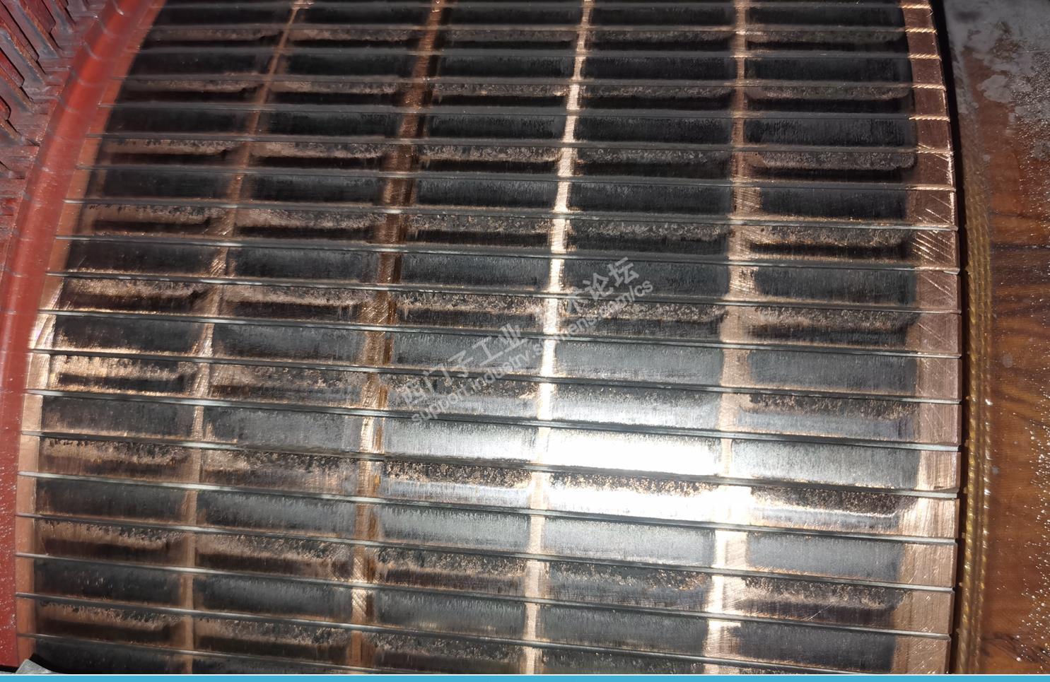 有一台Z450-4A的500KW直流电机,最近出现了很奇怪的现象,换向器打火很严重,换向器出现下面图片上的迹象,间隔着有打火的现象。已经对碳刷全部更换,用砂纸对换向器进行了打磨,处理后依然是打火严重,碳刷和换向器表面有电蚀迹象。电机工作电流500-600A之间,负载单向重载时多一些,电机已经工作五年了,工作方式没有发生改变。请教一下,这是什么原因导致的呢?谢谢。