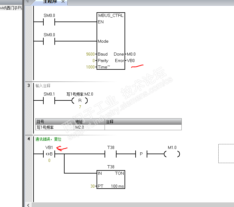 请教大佬,这个程序的4通讯错误,复位。比较指令为什么使用VB1去不等于0.