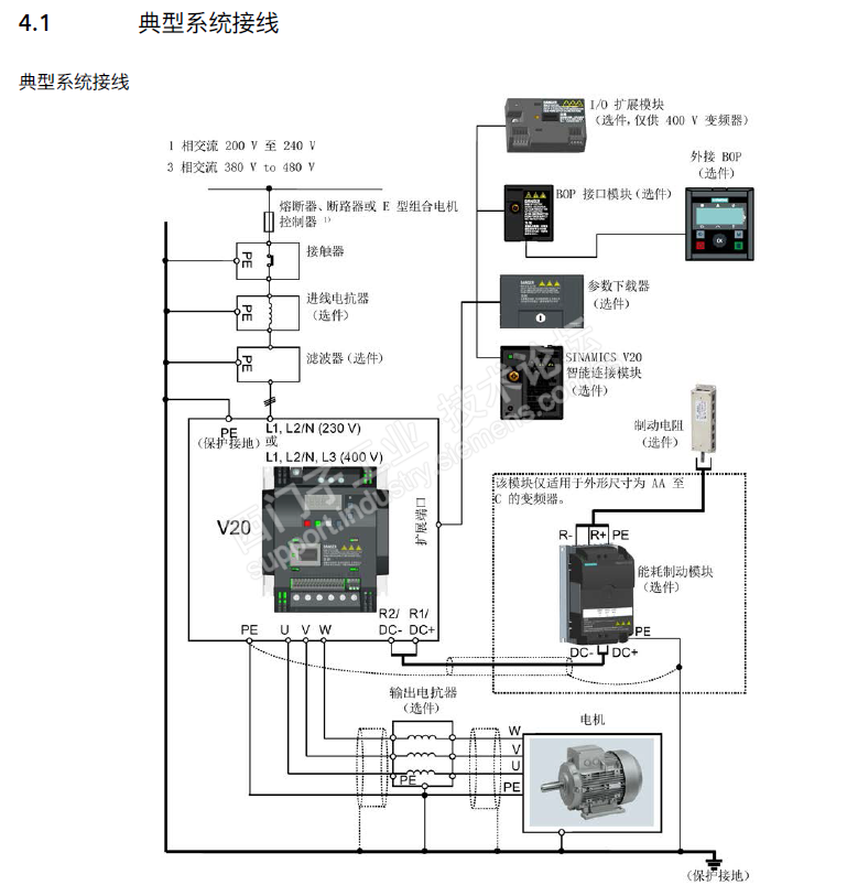 DC+/DC-接能耗制动模块,能耗制动模块的R+/R-接制动电阻。