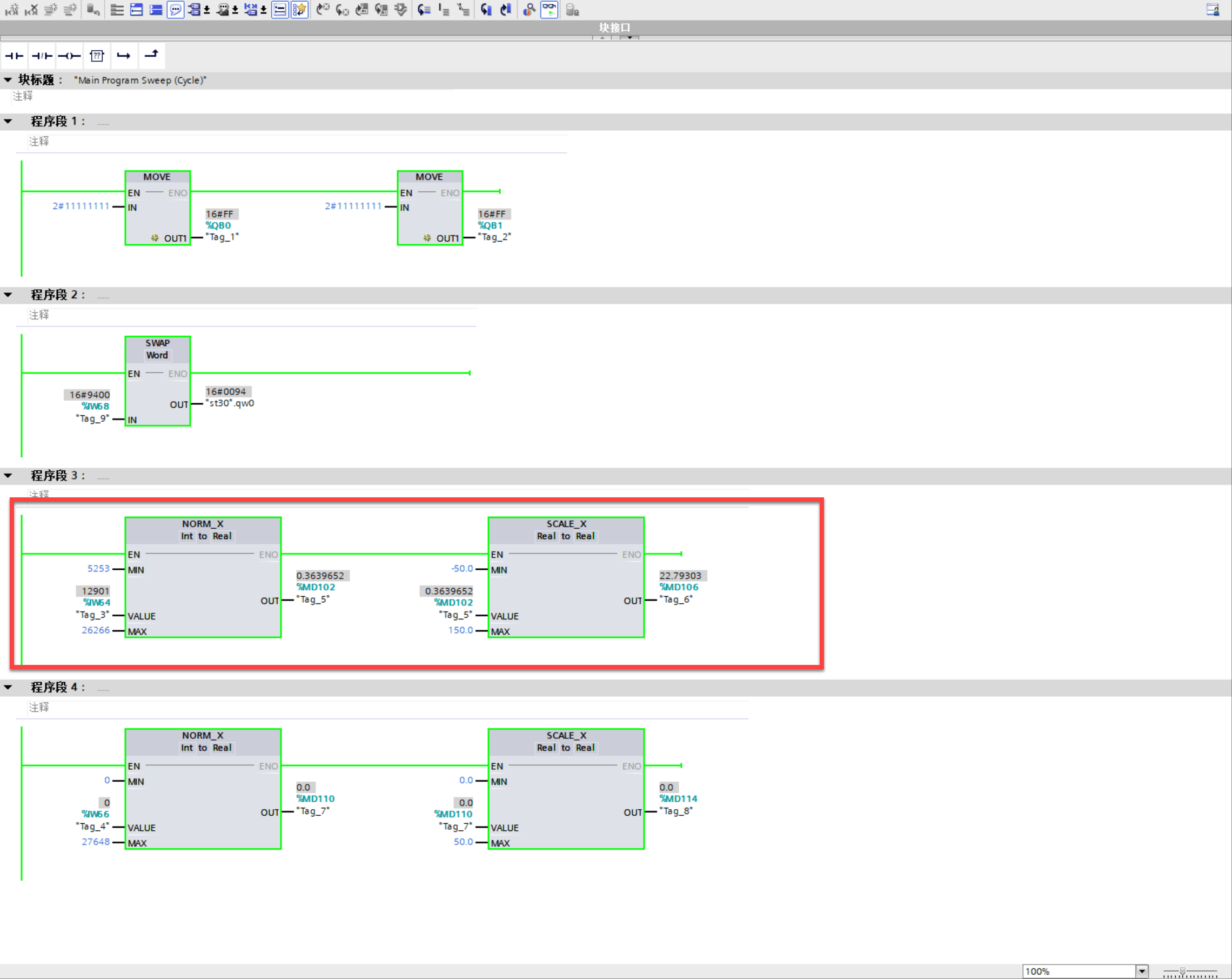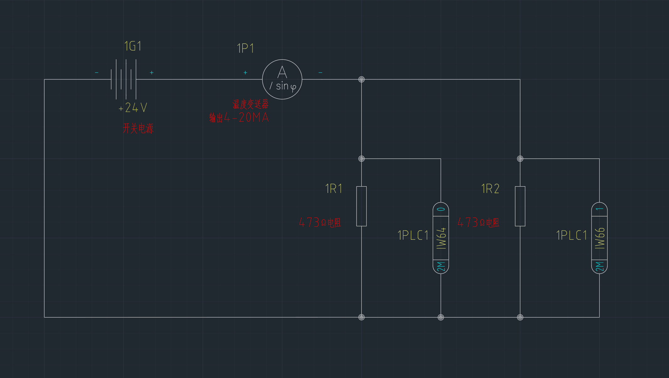 用的4个120Ω的电阻串起来,实测总阻值475Ω(理论上0-500Ω都可以,数值太小精度太低) 4ma对应1R1两端的压降1.9v,标准化块的min填5251 20ma对应1R1两端的压降9.5v,标准化块的max填26266 变送器的范围为-50-150℃ 测得变送器电流9.82ma(两端加24v电压,万用表串联测量),对应温度22.75℃