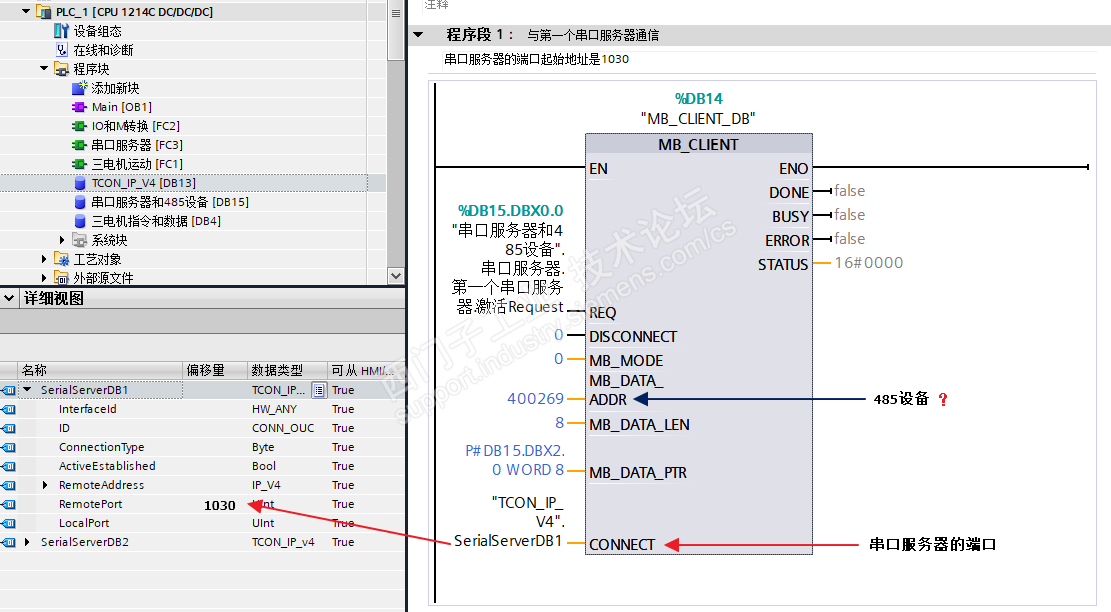 蓝色是接485设备的某个数据的地址的(如温度的),此温度地址是268。但是这种写法是PLC直接读485设备的,现在要经过串口服务器,不知道这种写法对不对?请大神赐教。