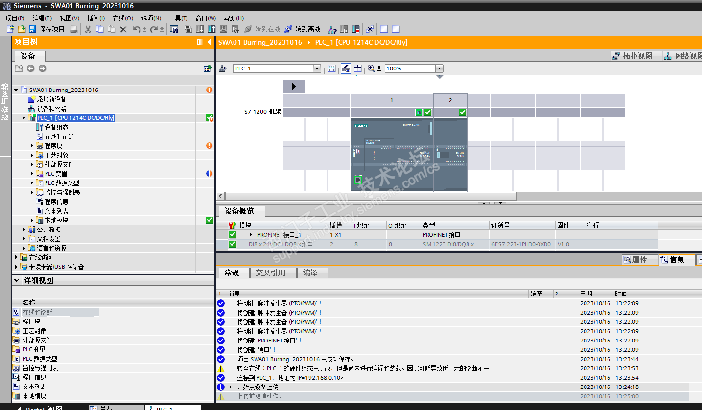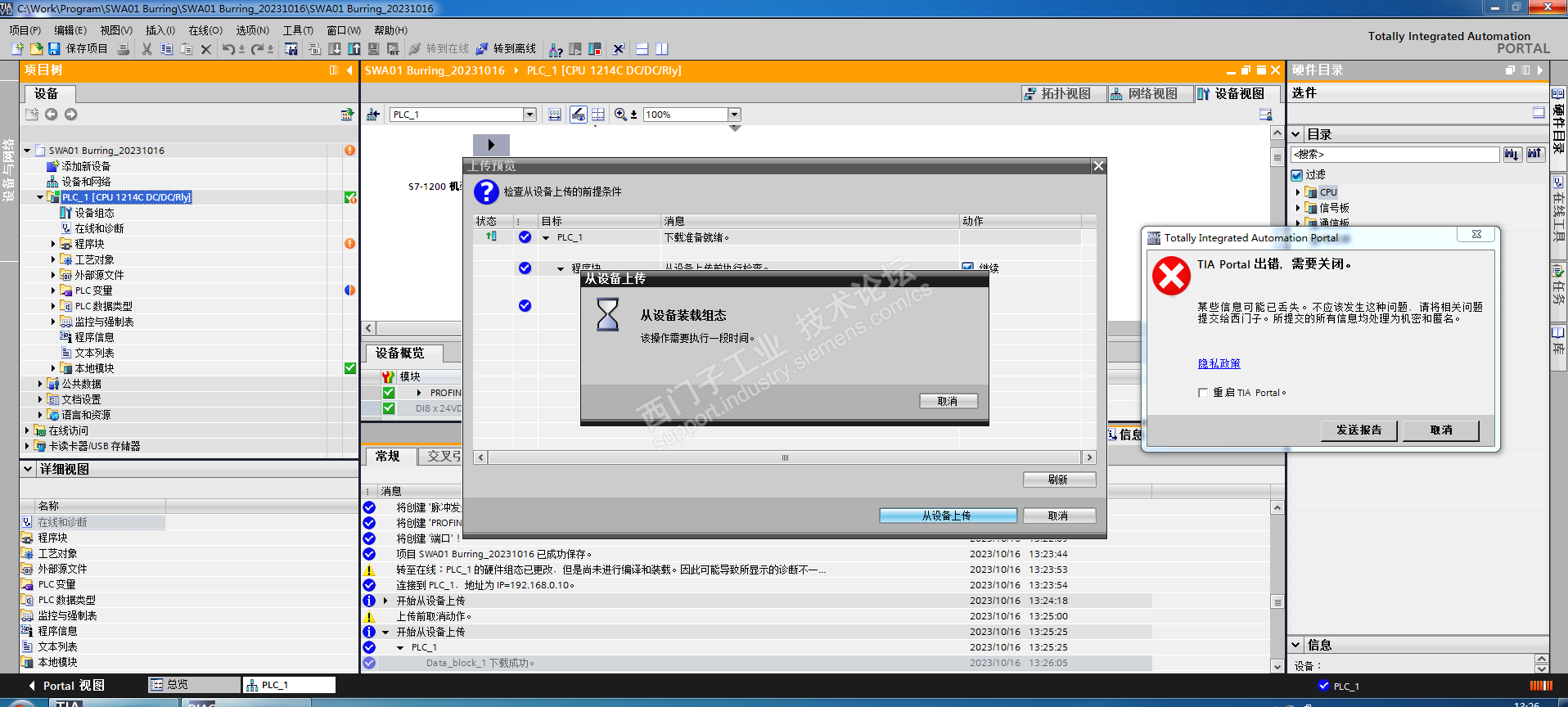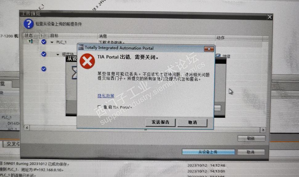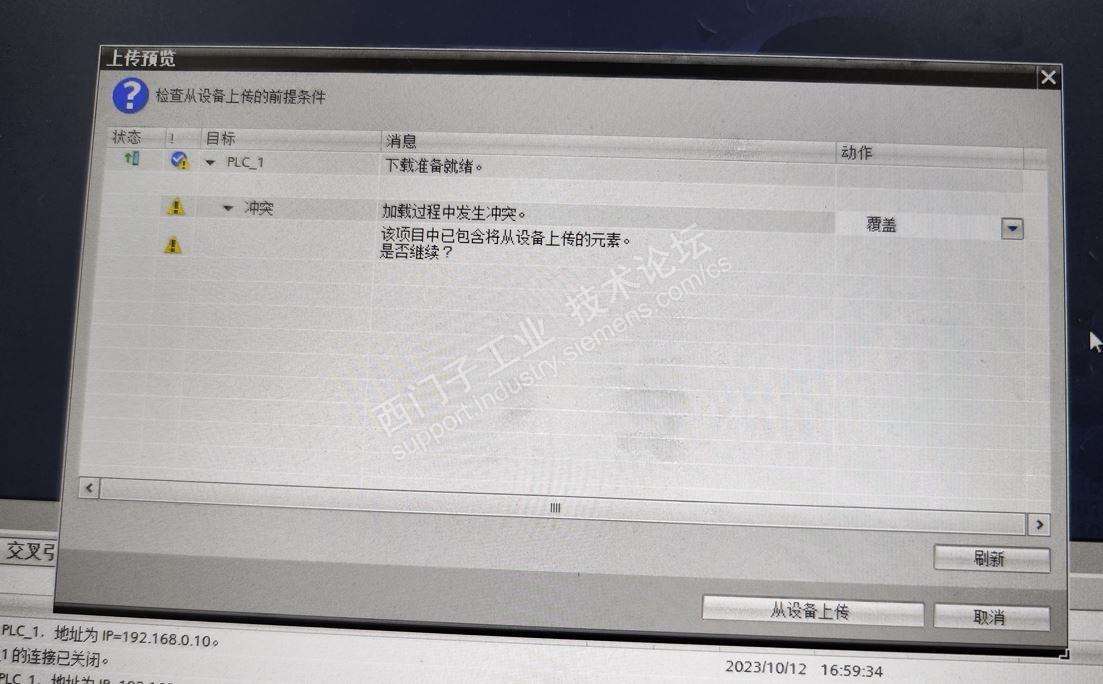 各位大佬,我这有台老旧设备使用TIA Portal V12.0 SP1,现在想增加功能,问题是可以在线但PLC上载一直失败,求指导!