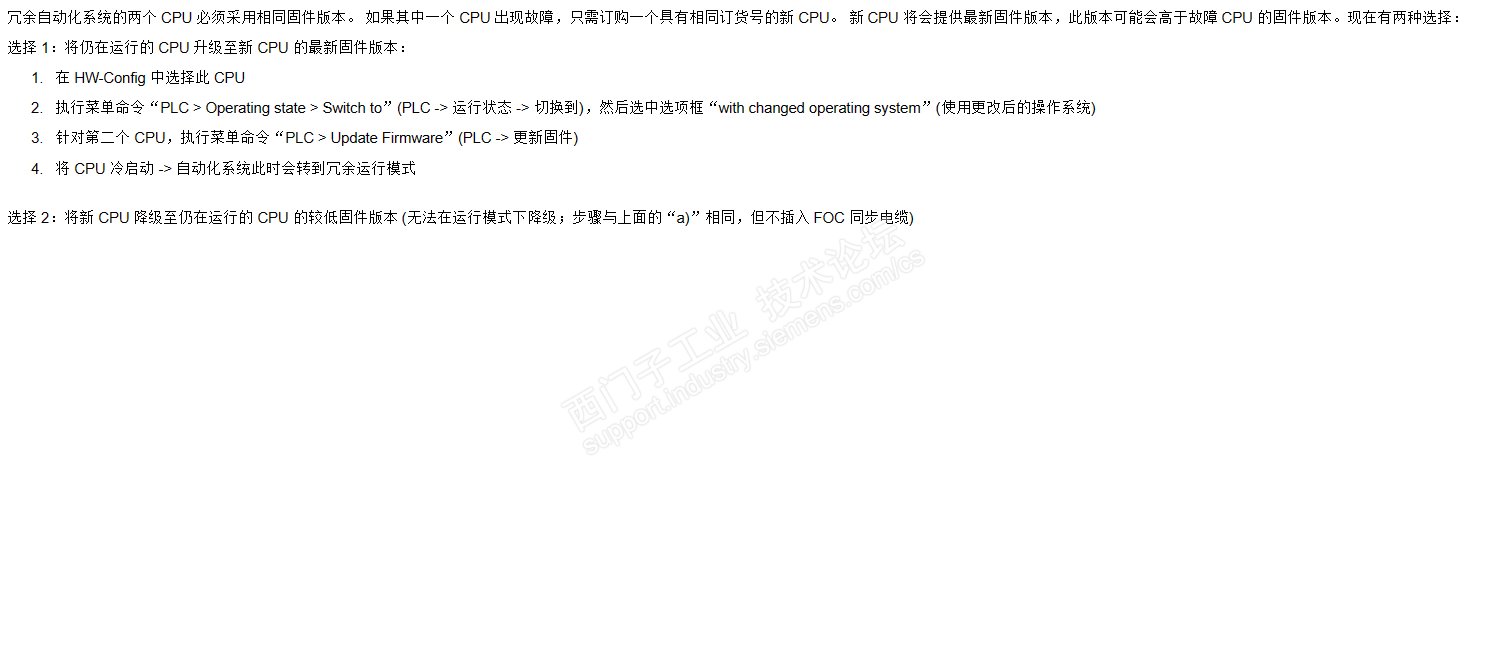 现场情况是这样的,设备使用的是412-3H容错系统,两台CPU的固件版本是V4.5.3,现在有备件3个,分别是两台固件版本4.5.2的和一台V4.5.6的,现在想更换其中机架1上的备用CPU,很悲催的和正在用的都不匹配,然后就想着降级,或者升级,我把V4.5.6的CPU插到机架1,然后自检完就直接报错,访问都访问不了,都不能发现这块CPU,更谈不上给它降级了。请大神们指导下,我的问题出现在哪了,看官方给的提示,太难了。。。。