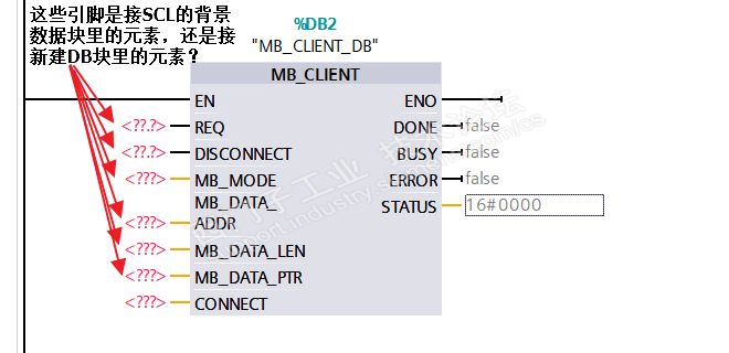 二,把MB_Client功能块拉进FC,它的引脚是接新建DB块里的元素,还是接SCL背景块里的元素?