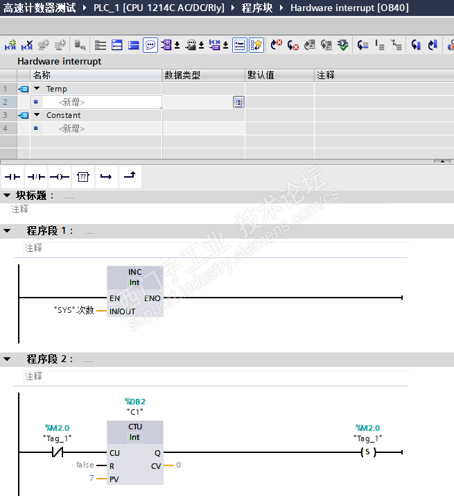 最近学习中断程序,用高速计数器HSC1产生一个硬件中断,在中断程序里用一个加计数器来计中断的次数,为何计数器只计了1次?而是用加1指令则没问题。