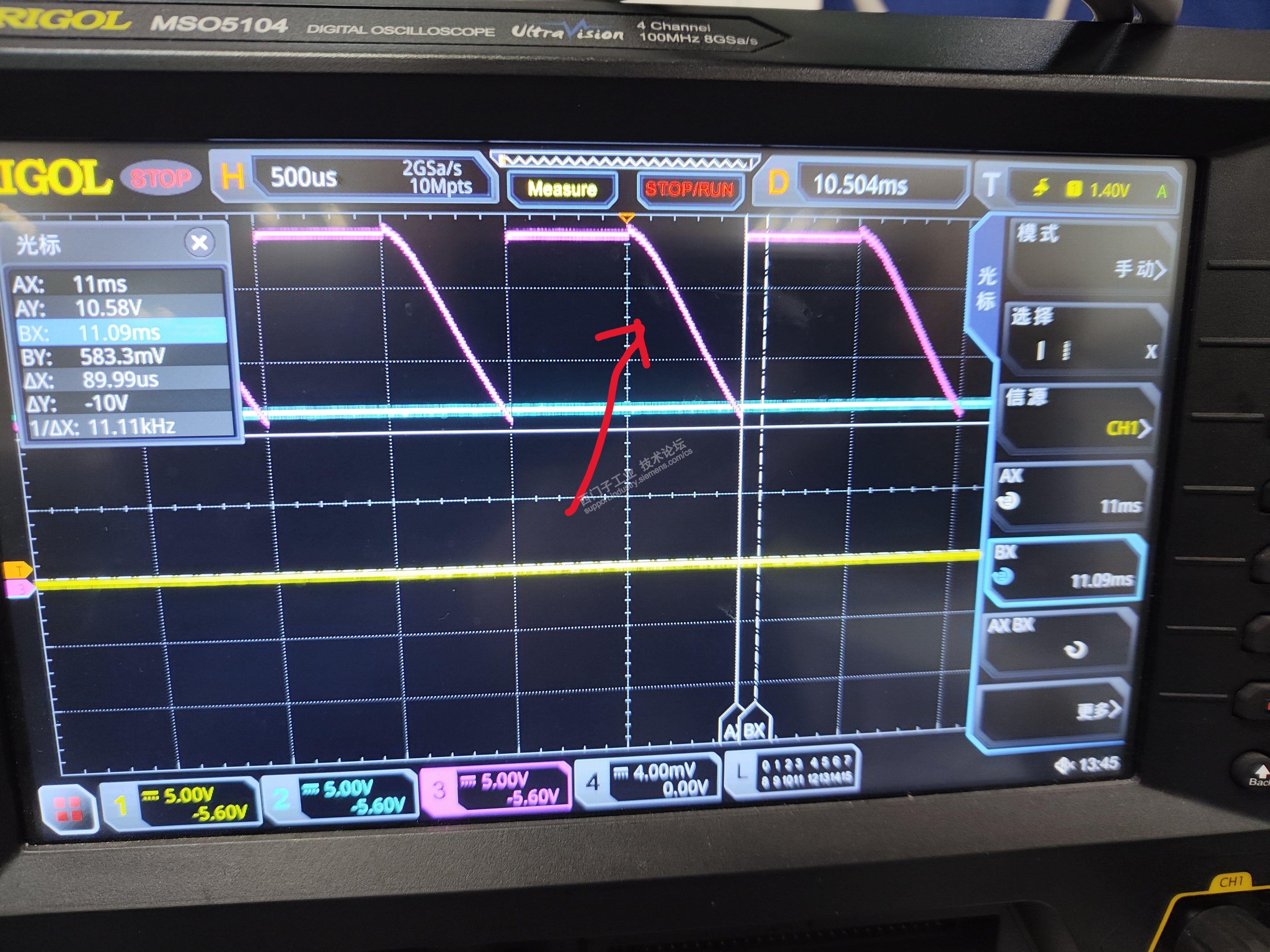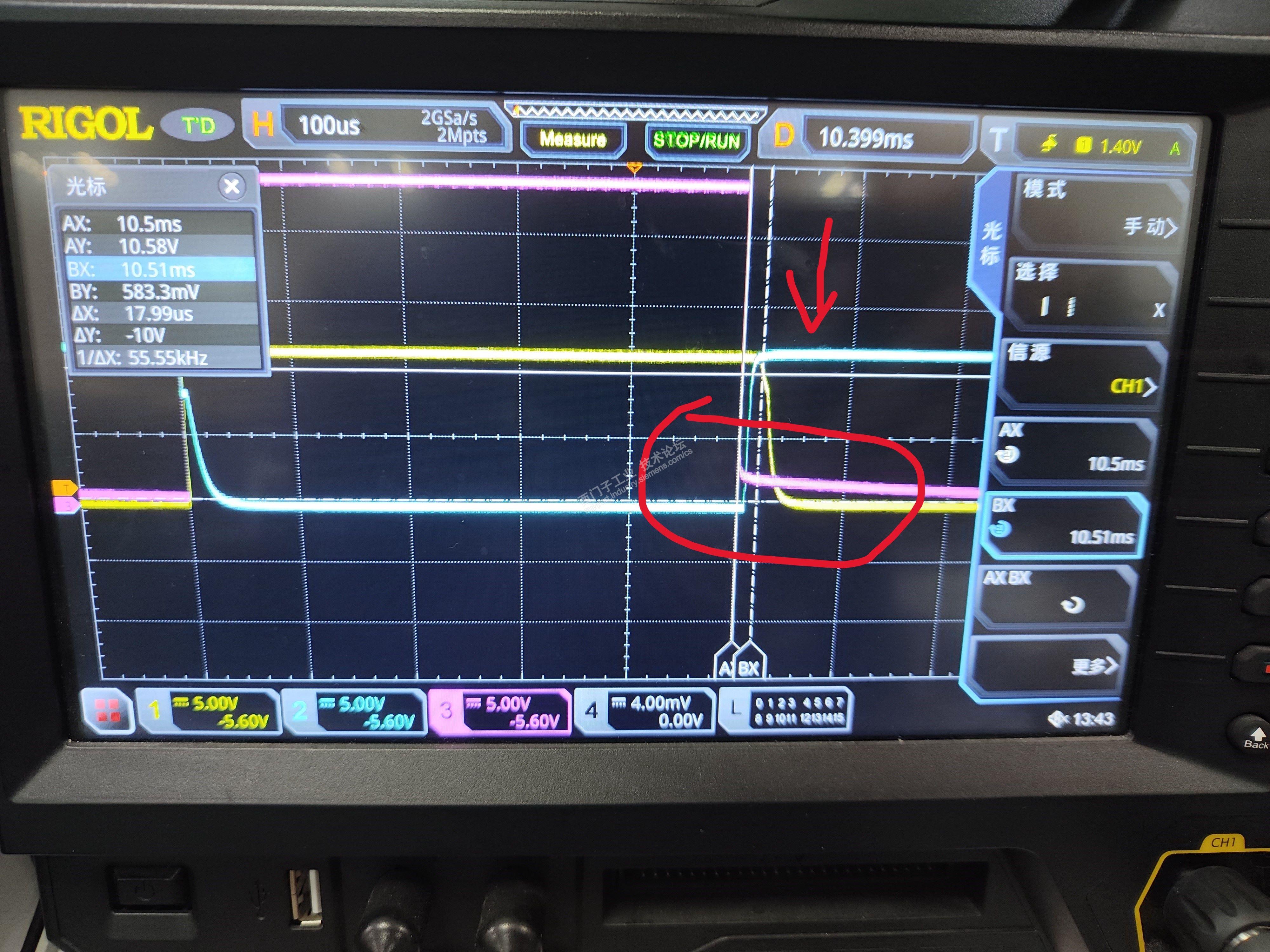 PLC 1214C/DC/DC/DC 使用PTO 指令 和PWM 指令,频率1000HZ,脉宽50%. 脉冲信号电源24VDC.用示波器实测出来的脉冲波形有问题,脉宽结束的时候,不是突然关断的,有一个几十微妙的关断延时,不知道有没有遇到过的?怎么解决这个问题呢。下图红色的波形为PWM信号,图一是带载,图二是空载,