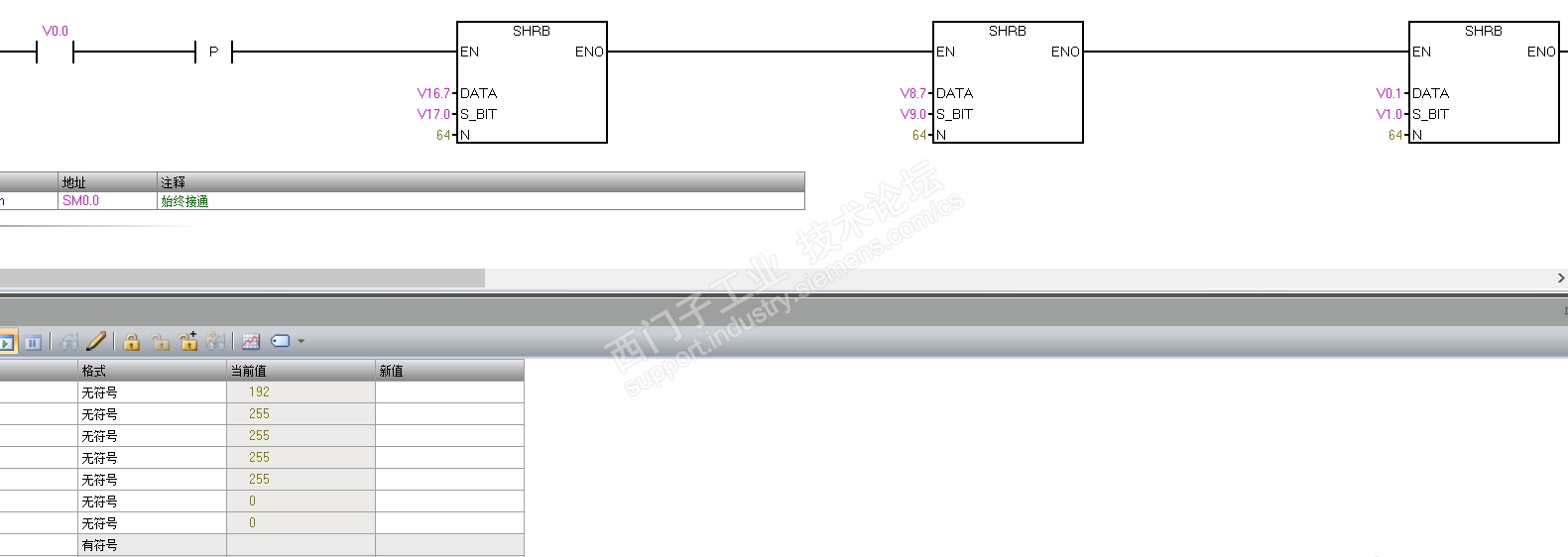 后来实验了一下,做了三次移位,实现了三菱STFL的效果,位数要多的就4次移位,5次移位向上加,移位的时候时候,要先移高位在移低位
