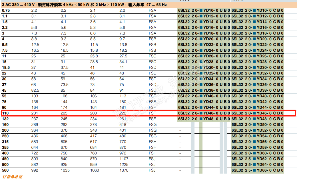 然后找手册,发现降容跟开关频率(P1800)是有关系的。但是变频器出场默认是4KHZ,以110kw变频器为列,对应表格就是输出141A。图2为对应表