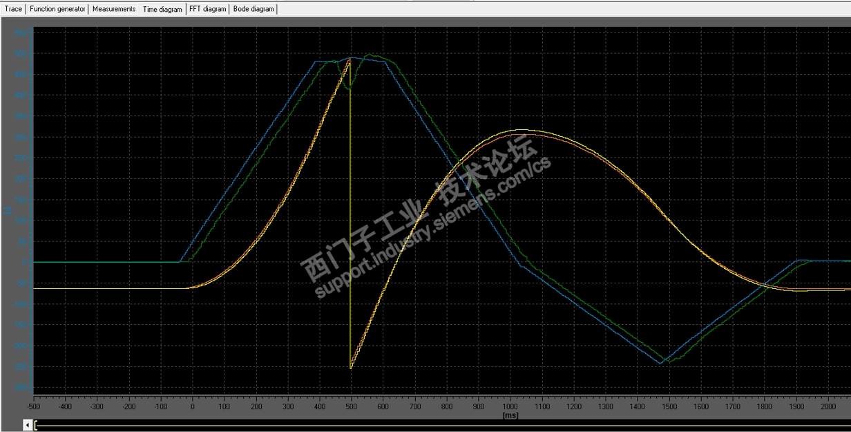 蓝色-速度设定值;绿色-速度实际值;橙色-位置设定值;黄色-位置实际值。