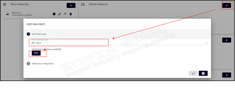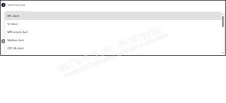 下拉选择类型,这里可以看到BFC支持向下连接的设备类型。SinuTrain模拟的是西门子的机床,所以这里我们可以选择BFC client。然后点击next。
