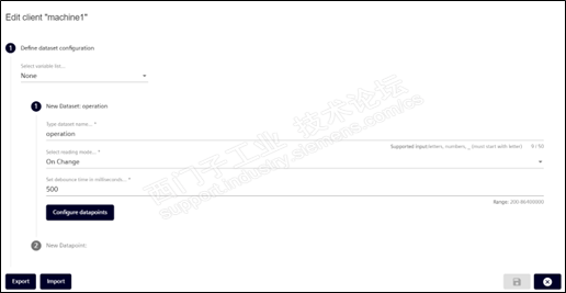 - 输入变量集合的名称,如:production。选择采集的方式,On Change:变量变化时采集;Interval:根据时间间隔采集;On trigger:参数触发采集。设置采集的频率,如500ms。