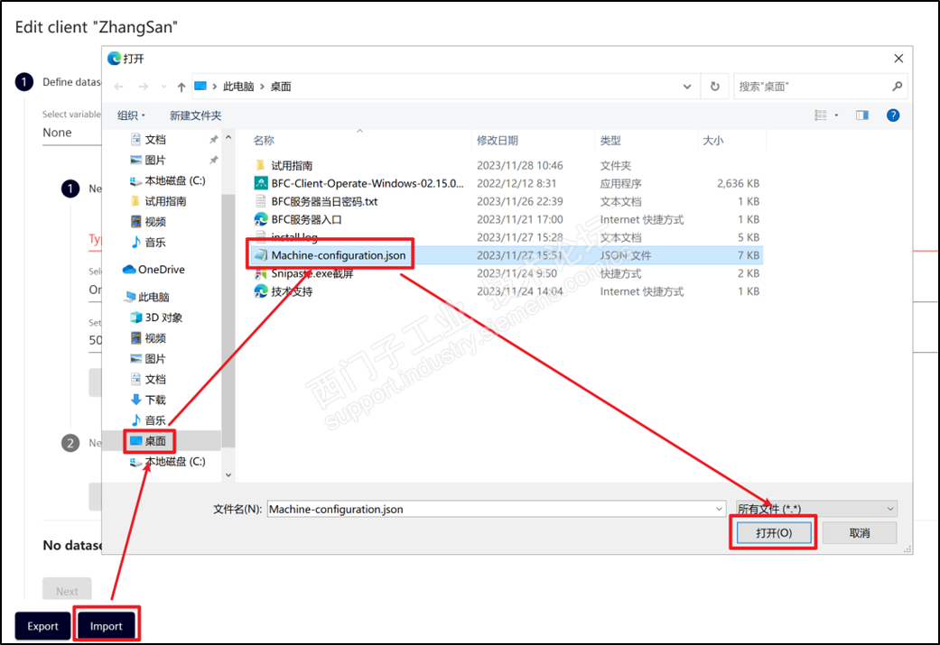 除了手动输入变量,BFC还为您提供了标准的变量模板供您直接导入。您只需要点击配置页面中的Import,选择桌面,选中“Machine-configuration.json”文件,点击打开。