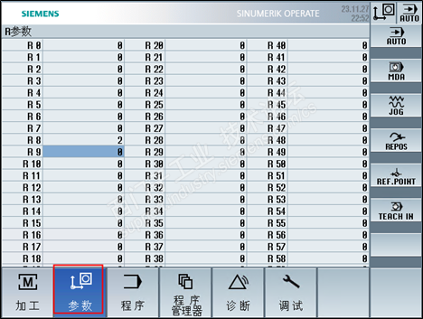 然后,在sinutrain上修改R8参数。点击选择菜单“M”按钮→点击“参数”按钮→切换到“用户变量”页面→点击“R参数”。如下图: