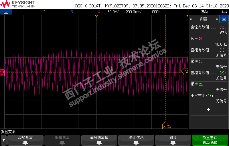 变频器带一组对拖电机组的异步电机,欧姆龙差分编码器反馈转速,编码器反馈信号还是很好的,但是变频器空载的电流随频率增大而小幅度增大,而且电流就出现如下波形,有几个脉冲段就开始电流忽然高于前后几个电流波形,这叫做什么,为什么会出现这种状况?最后一张图片是展开后后电流波形,明显有几个正弦波就高于其它正弦波,应该是什么问题?