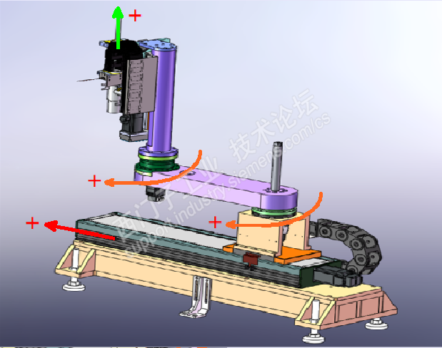 如下图,公司项目为了节省用四个V90设计了一个四轴机器人,其中垂直轴只是用于产品夹紧换型所以不参与讨论,实际就是一个三轴机器人系统。plc采用的是1515T来控制。