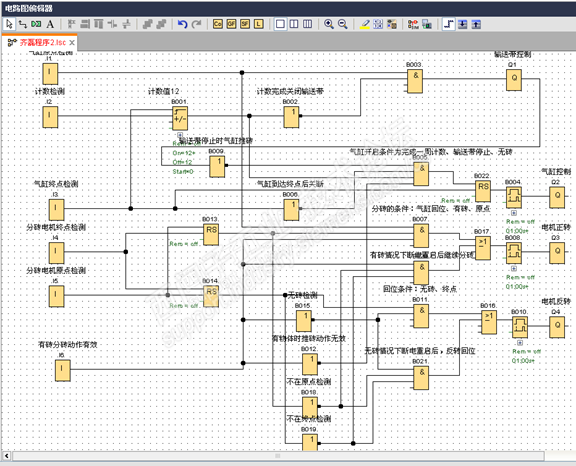 分砖通过电机的正反转控制,手爪取砖的数量为12块,通过光电开关检测,由计数器计数。主要的检测点有气缸原点检测、气缸终点检测、分砖电机终点检测和分砖电机原点检测。