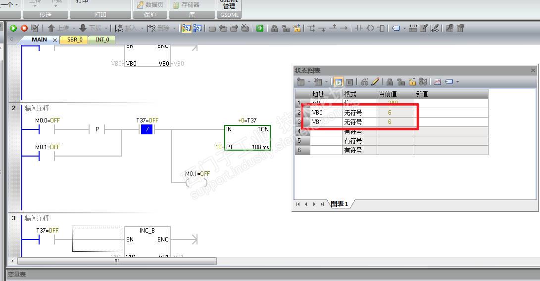 再次将定时器T32改为T37(时基100ms),结果,VB0和VB1同时得到加1的结果,图示: