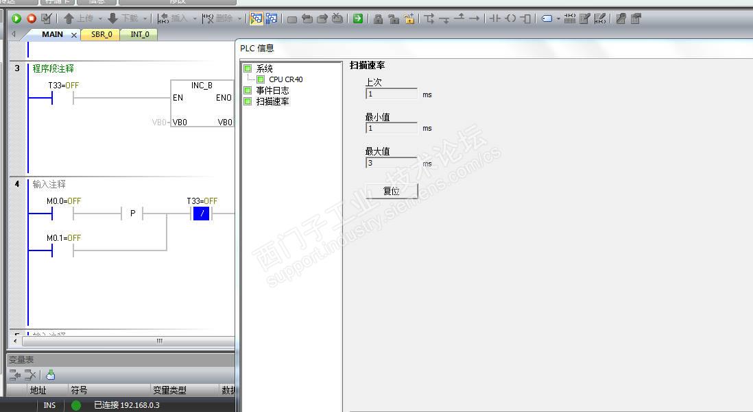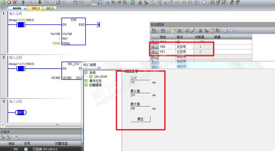 加了for后,cpu扫描周期加长后,测试的结果: