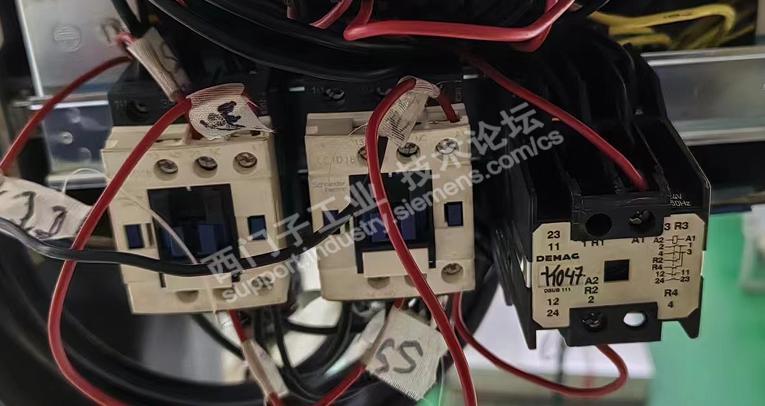 公司内一台进口的德马格行车,使用了18年了,近期出现了一些问题,上升下降有点失控。一般这种情况下都是主电路正反转接触器问题。打开电箱门。