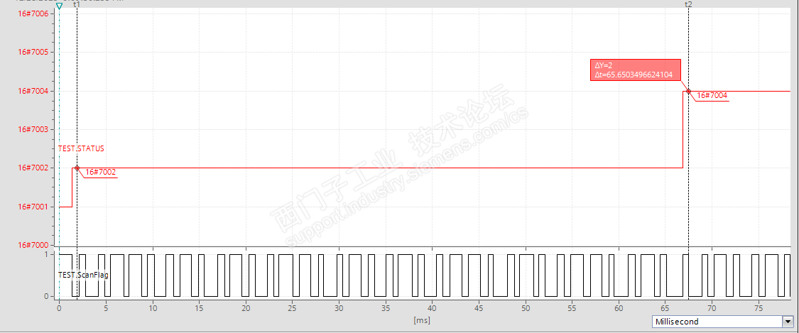 7002大概持续65-67ms时间,在我这1200上持续了60-70个扫描周期。7004算接通。