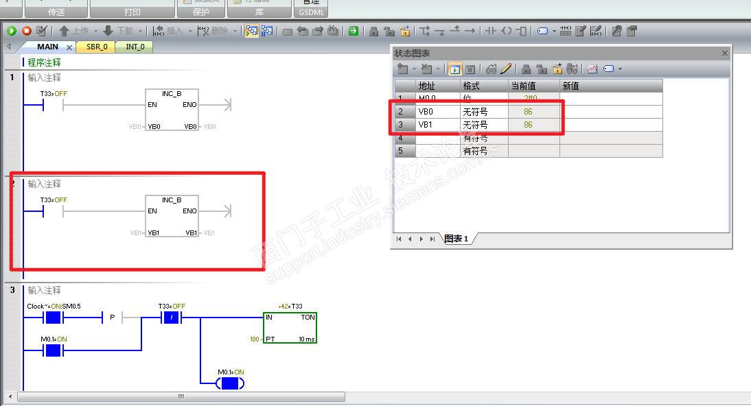 10ms 定时时间到,本周期T33位1 扫描 T33位1--VB0动- --T33位1-- TON输入OFF- - TON更新 T33位0 --- VB1不动。即使当TON和VB1之间的扫描间隔时间大于定时器值,定时器也不会更新,T33位依然为0,VB1不变化。