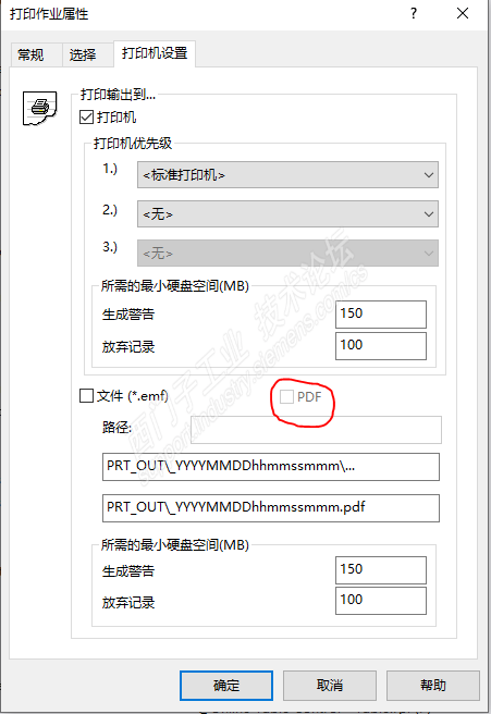 如下图,wincc通过打印机打出来的PDF文件显示不全,各位有知道怎么回事吗?还有打印机设置界面,PDF画红圈的地方,为什么是灰色的,不能修改?