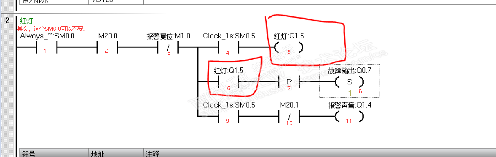 第二行程序常开点Q1.5和第一行线圈Q1.5两行程序换下,线圈Q1.5刚导通的那一个周期,Q1.5的常开点是在这之前执行,所以不影响还是常开。