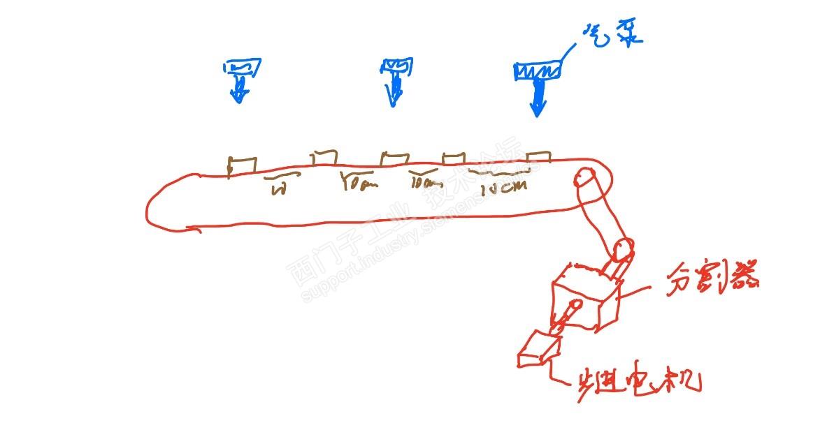 如图 每距离10cm都是一个膜具,当传送带刚好停下时候,气泵通电下压,