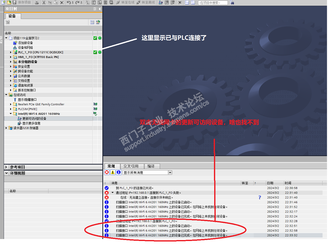 现在的问题是,可以连接上PLC,但是在线访问这边,用无线网卡,更新可访问设备,啥也找不到,如下图