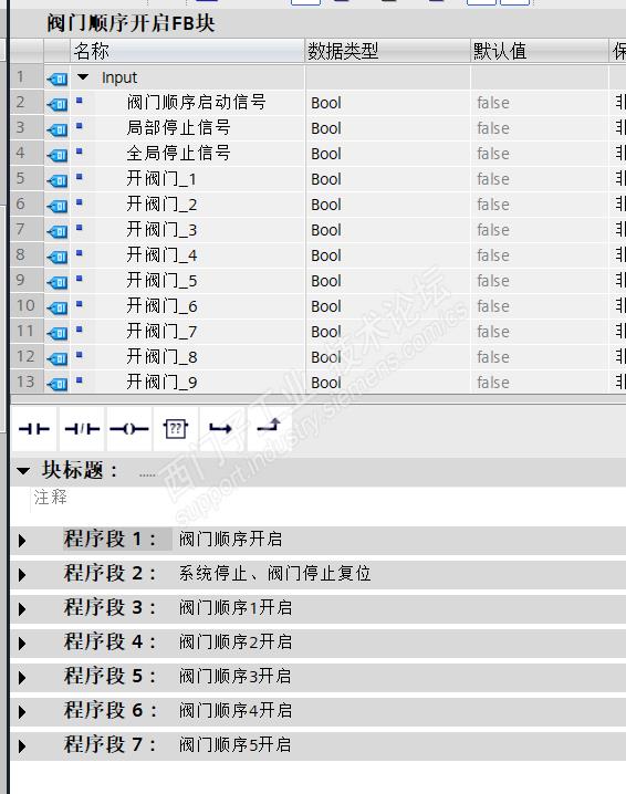 可能比较麻烦,不过用着还行,提供这个笨办法供大家参考:按照阀门编号建立输入变量 阀门编号bool(45个)、阀门顺序byte(45个)、阀门动作间隔时间time(5个),建立中间变量阀门动作bool(45个)、建立输出变量阀门动作bool(45个)