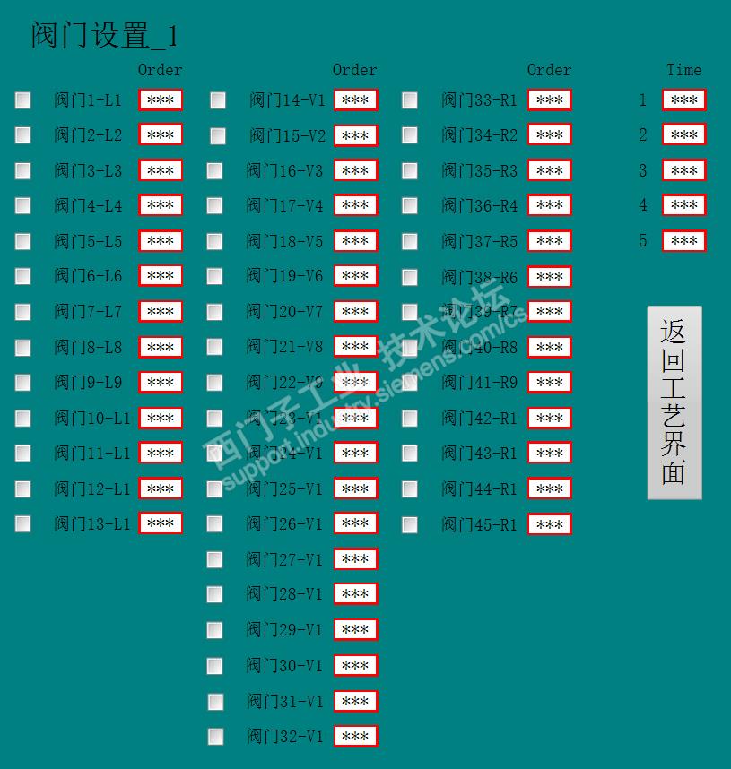 以前做过这种,一共45个阀门,要求自主勾选需要动作的阀门、自主设定动作顺序、自主设定间隔时间