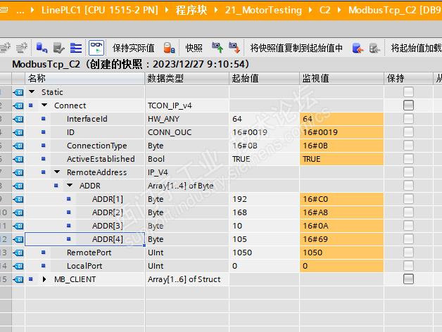 这个是参数设置。用Modbus TCP调试助手 给上位机发送报文,上位机是可以收到的,没问题,到PLC这里就一直报错80C3
