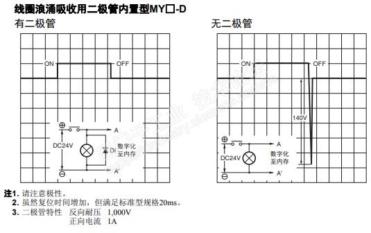 既然你举例了欧姆龙的MY2系列,下图就是,欧姆龙MY2系列里面带续流二极管型号(-D)的特性数据,可以供你参考