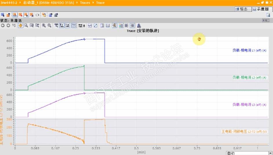 在实际应用中跟踪功能屡立大功,现场软起动器调试时经常发生启动或停止时,发生热过载保护,工程师需要根据经验调节启动电压,启动时间以及限流等参数,最终得到一个平衡的参数组。另外,在电机运行中,突然出现莫名其妙的过载,负载缺失等报警,故障分析一时无从下手。上述两种情况是软起应用现场经常遇到的问题。如果配合电机数据实时跟踪功能,工程师可以对电机起停以及发生故障时的电压,电流以及配合触发条件,对实时情况有更精确更透明的了解,故障分析及起停调试事半功倍。