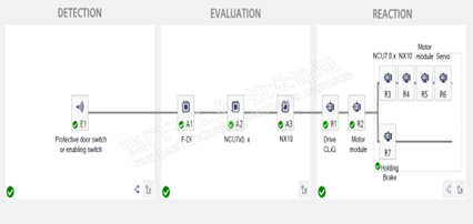 2. 安全等级设计和自动计算,根据评估等级,在庞大的西门子安全产品VDMA数据库中选择安全输入,安全评估和安全执行元件,设计安全回路,系统自动计算安全等级,数据显示清晰易懂。