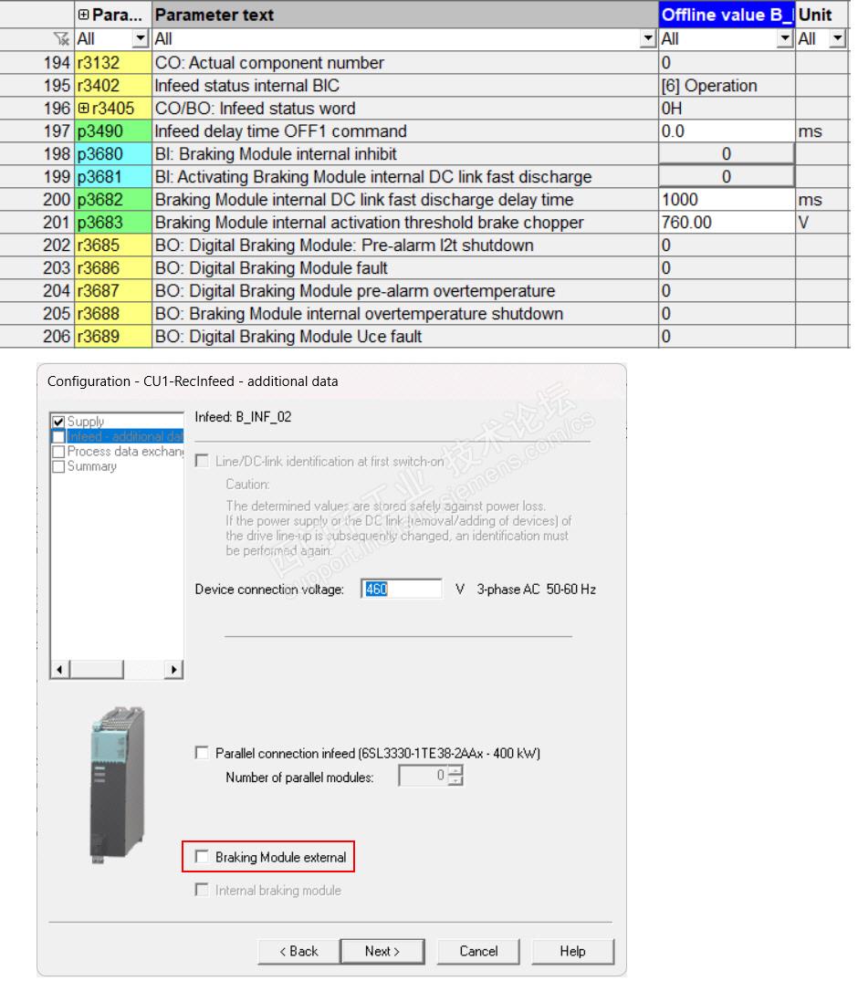 之前发在找答案里,有网友回复说只需在配置整流单元时勾选“Braking Module external”即可,但是另外一台早已调试好运行几年的设备采用同样型号的S120 制动单元,也是安装在电机模块里。在它程序里打开参数项目,重新点击 Infeed 的配置按钮,发现它并未勾选“Braking Module external”。所以我对这个答案还有疑问,所以跟大家再请教一下,谢谢了。