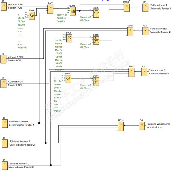 输出Q1的自动喂食器1供应幼鱼。每天从上午8点到下午6点,每小时提供一次饲料。通过内置的时间开关和脉冲发生器(设置时间=30分钟),可以每小时生成一个脉冲。