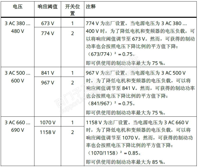 外置制动模块的激活,是由S1阈值开关(在制动模块上)设定的工作电压决定。直流母线电压达到设定值,制动模块就会工作。