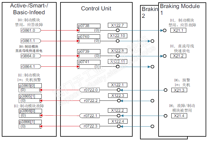 在二进制互联输入 p3866 上报告制动模块出现故障时,书本型制动模块端子 X21.1 上每 10ms 便发出信号 r3861 应答故障;装机装柜型模块上由端子 X21.3 应答故障。并同时输出报警 A06900。