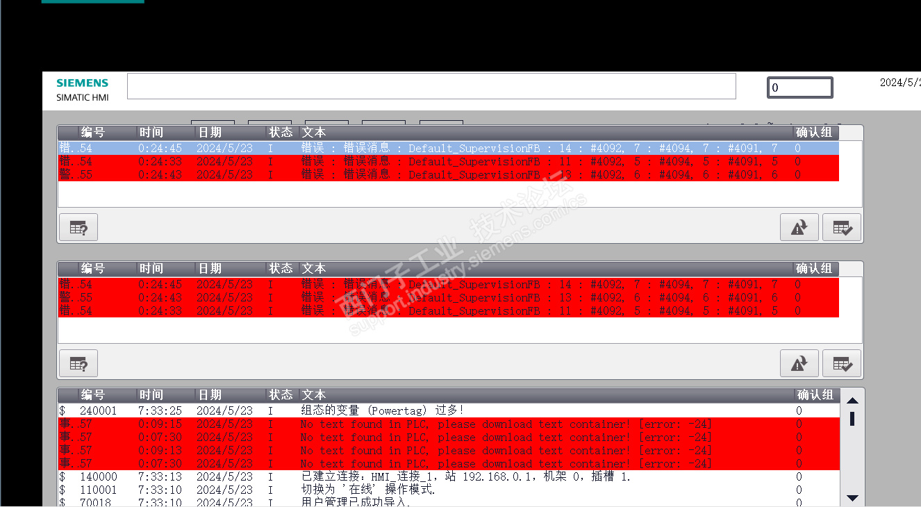 TIA V19, 在触摸屏的报警栏里显示 No text found in PLC, Please download text container! [Error -24]。 这个是哪里问题,怎么处理?