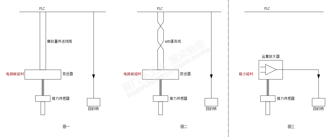 推力传感器是个电阻桥,被压得形变后电阻桥失去平衡,就产生电动势,经过变送器后,以模拟量或者485信号输出给PLC。485通信时候在1秒以上,时间太长;模拟量速度快些,但是也要经过变送器,而变送器里有复杂的电路,也会造成延时。我觉得这两种方案都不行。如图一和图二