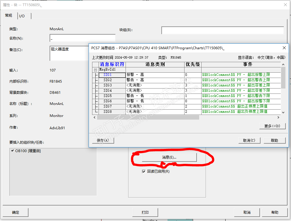 如截图所示。“消息类别” 列中选择的 “<无消息>” 就是 不使用。而一些上、下限报警或警告 还需要在 CFC 块的一些管脚上进行 使能 设定。