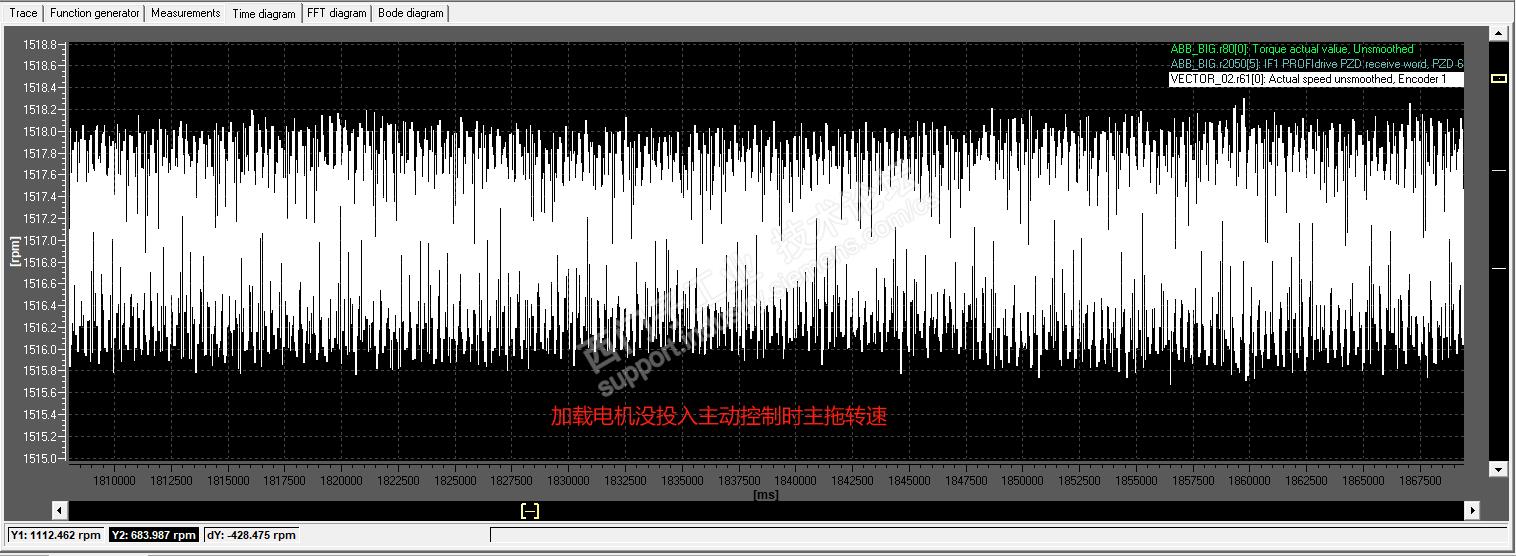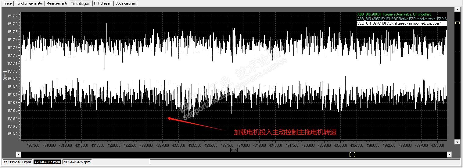 白色的曲线是主拖动电机的曲线,上面trace的曲线周期比较长,看出来是平滑曲线,当波动比较大的时候 是会影响到主拖动电机的。现场的增速箱震动也进行了测试,横振是没有问题的,是不是可以说明箱子内部没有打齿的现象? 这块我也不太明白。下边是加载电机投入主动控制后主拖转速情况对比: